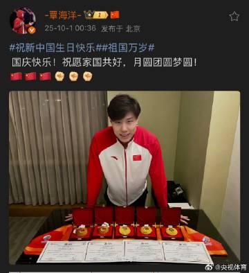 Following his remarkable achievement, Qin took to social media to share a photo of his five gleaming gold medals. In his post, he expressed warm sentiments, writing: ‘Happy National Day! Wishing for harmony between family and nation, and dreams fulfilled under the full moon.’ This message resonated with fans, highlighting his pride in both personal success and national unity.