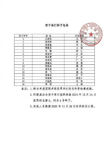 The Chinese Table Tennis Association has officially released the seedings and participant list for the upcoming 15th National Games table tennis finals, revealing the top contenders in both men’s and women’s singles categories.